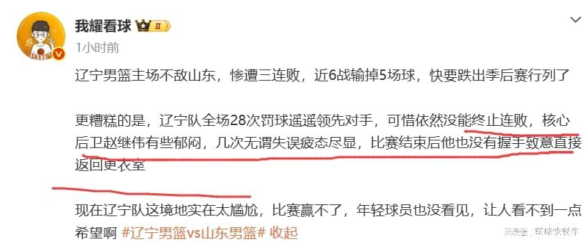 CBA常规赛第18轮继续进行,四冠王辽宁队在主场以79-84不敌山东队,惨遭三连败,这也是他们最近6场比赛输掉的第5场比赛。球队的战绩也一泻千里,直接变成8胜10负,胜率不足5成,排名也下滑到积分榜第12名,季后赛形势变得岌岌可危。而在主场无缘14分大逆转后,作为球队的核心球员,赵继伟也是郁闷至极,赛后连基本的礼仪也不顾了,拒绝与山东队球员握手,直接和威尔斯一起,走回更衣室。